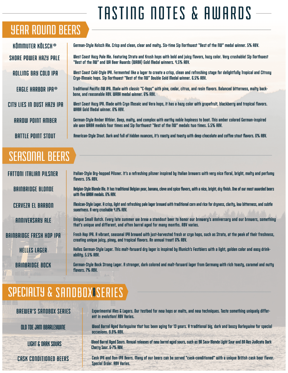 Don’t miss the boat on our traditional German-style Kölsch: fermented cool and lagered for maximum clarity and a bright, clean, and refreshing taste. Winner of multiple Platinum & Double Golds from SIP Northwest, this Kölsch is the perfect beer on a warm day or while crossing the Sound on the Washington State Ferries!
